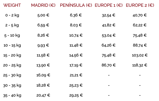 Below, we show the different shipping costs based on the weight of the purchase according to the destination: